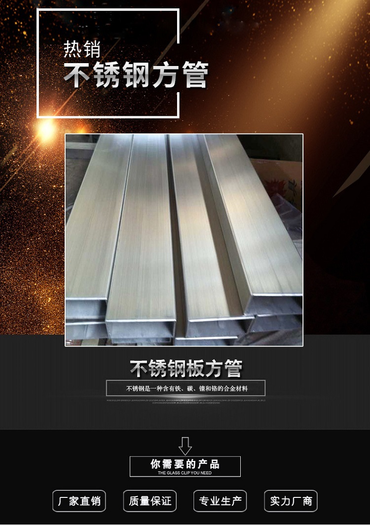 304不锈钢方矩管是一种中空的长条钢材,因为截面是正方形所以叫做方管。大量用作输送流体的管道,如石油、天燃气、水、煤气、蒸气等,另外,在搞弯、抗扭强度相同时,重量较轻,所以也广泛用于制造机械零件和工程结构。